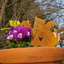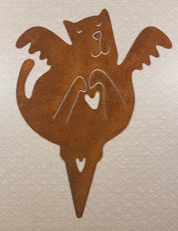 Änglakatt krukprydnad i vacker rostig cortenplåt. Figuren har en spets i nedankanten så att den kan stickas ner i en kruka, blomlåda eller rabatt,