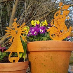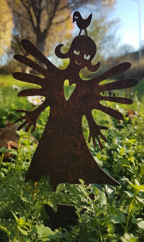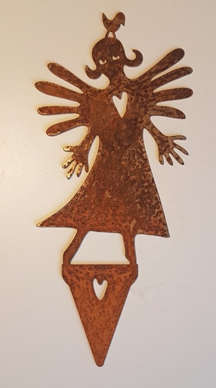 Piggelin krukprydnad i vackert rostig cortenplåt med mycket patina. Figuren har en spets i nedankanten som kan stickas ner i en kruka, blomlåda eller rabatt.