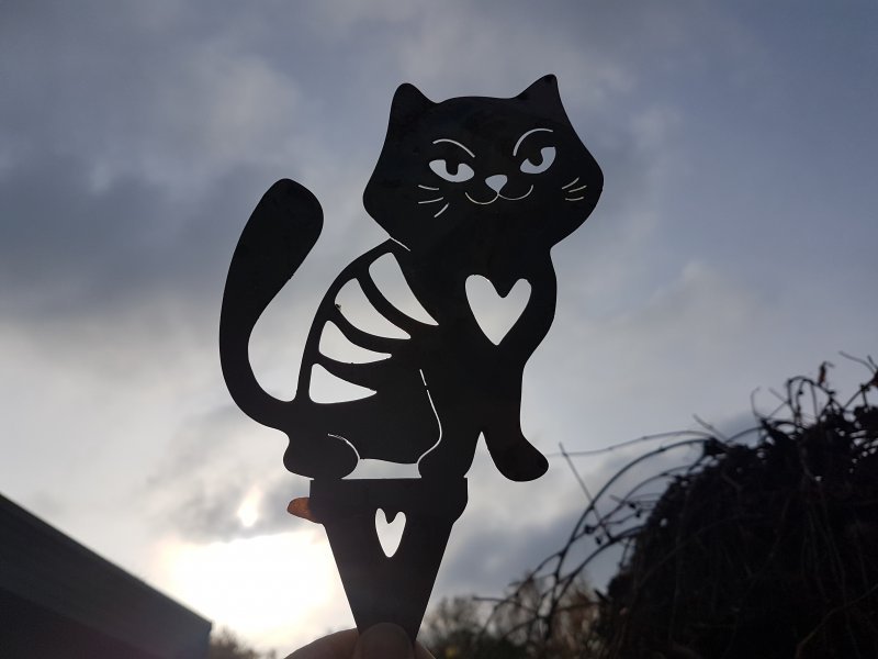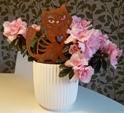 Krukprydnad katt i vackert rostig cortenplåt med mycket patina. Katten har en spets i nedankanten som kan stickas ner i en kruka, blomlåda eller rabatt.