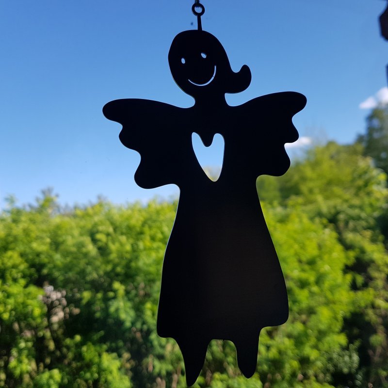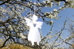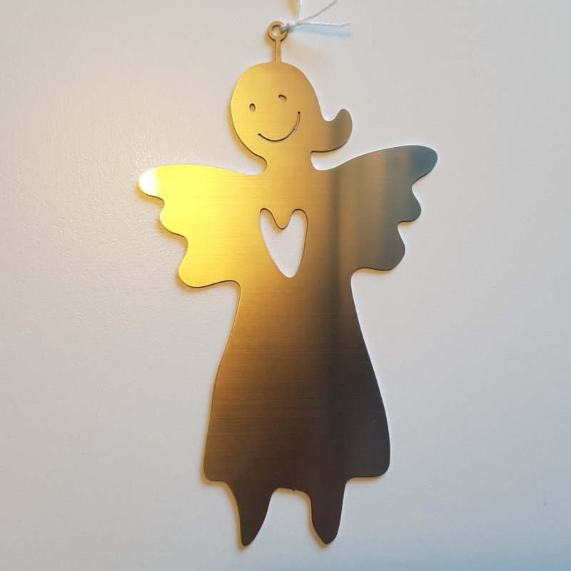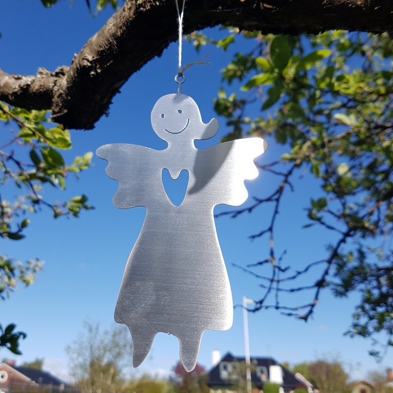 Hängande liten ängel i rostfritt stål. Fin att hänga både ute och inne. Passar som dopgåva.